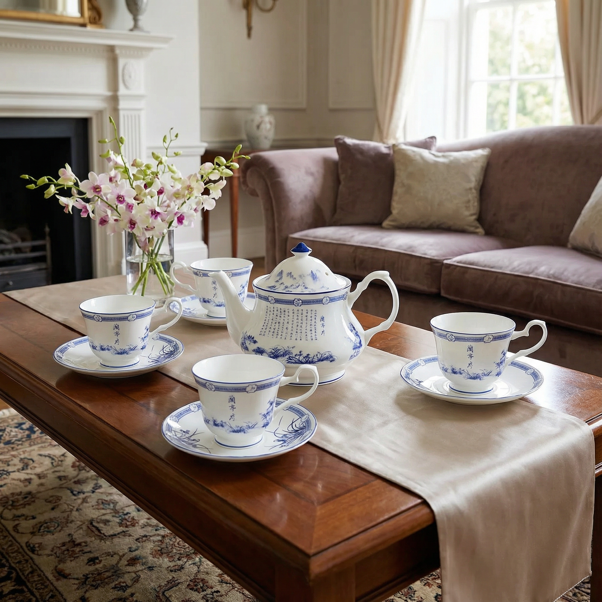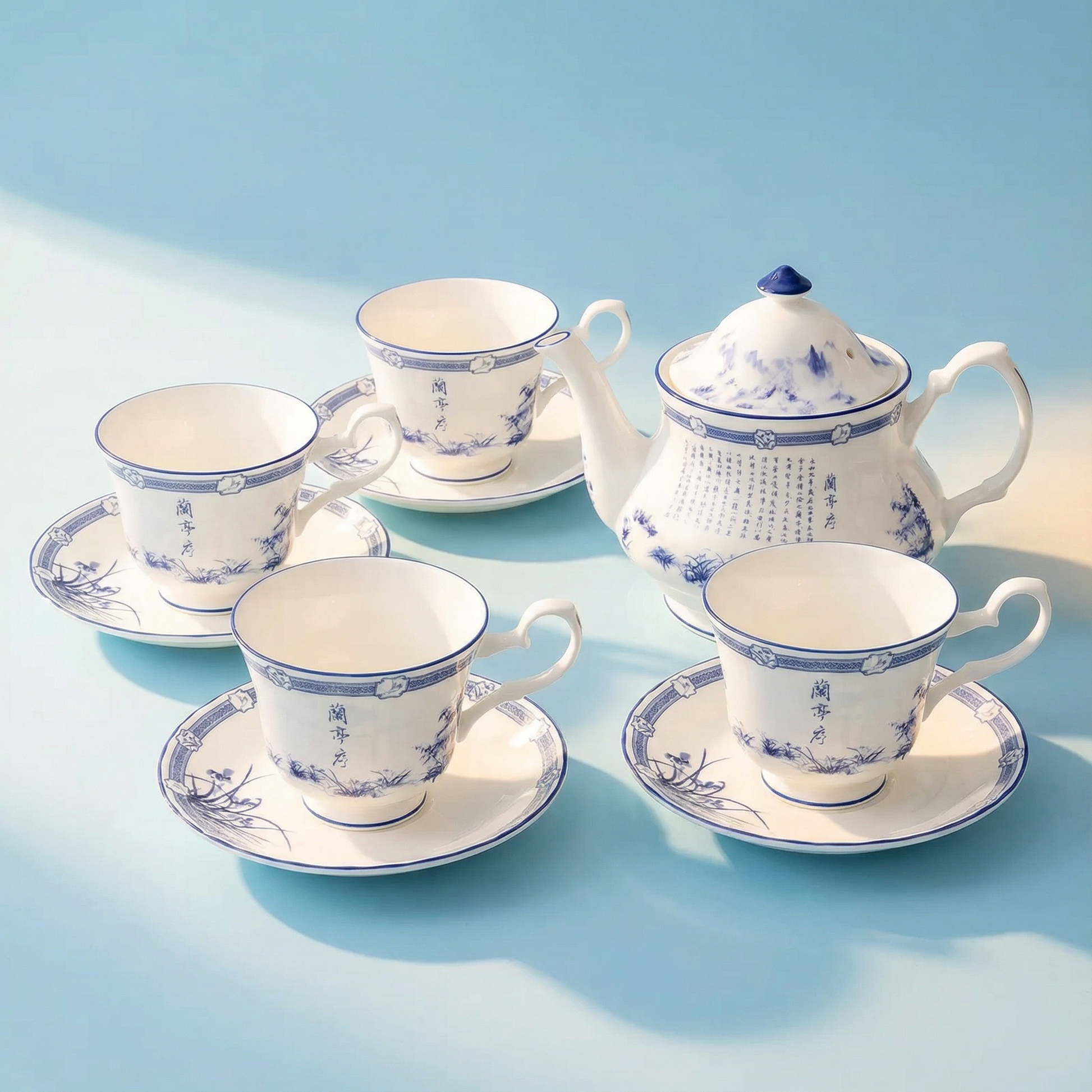 This tea set showcases a classic landscape aesthetic rendered in traditional porcelain colors, inspired by the timeless masterpiece Preface to the Orchid Pavilion written by the “Sage of Calligraphy,” Wang Xizhi, at Mt. Kuaiji in 353 C.E. Crafted in Britain from premium fine bone china, each piece features a delicate, translucent texture while offering exceptional durability and chip resistance. Blending the beauty of Eastern culture with Western craftsmanship, this elegant and practical tea set is an ideal choice for daily tea enjoyment, entertaining guests, or gifting and collecting.