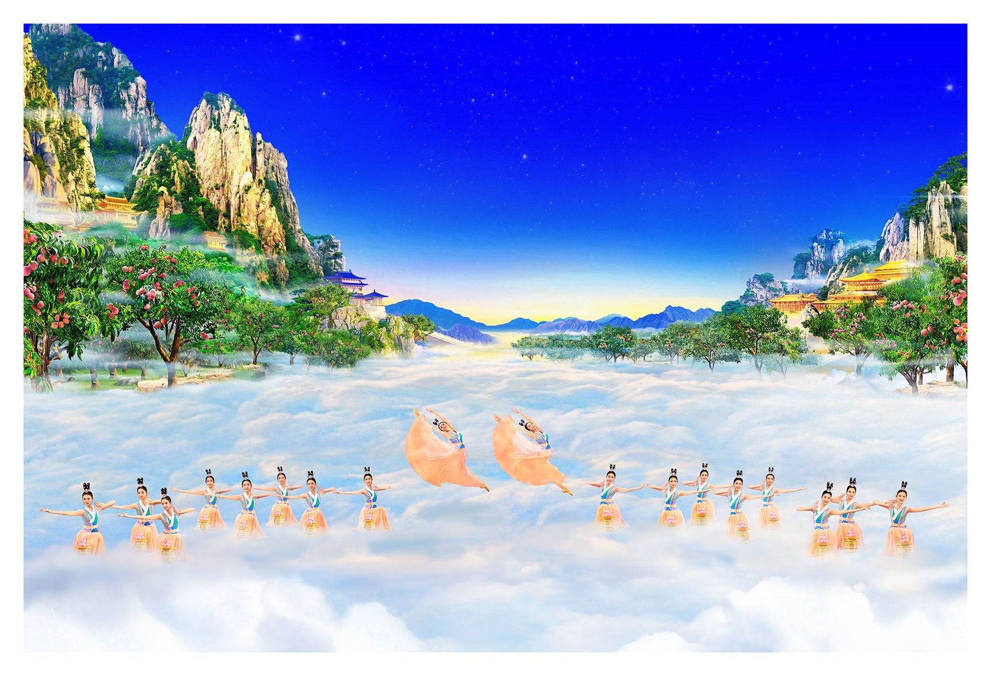 此幅畫作的場景取自神韻舞蹈作品《採桃仙子》:桃花世界桃花仙,吸風飲露三千年。一顆蟠桃迎佳客,福如東海壽齊天。