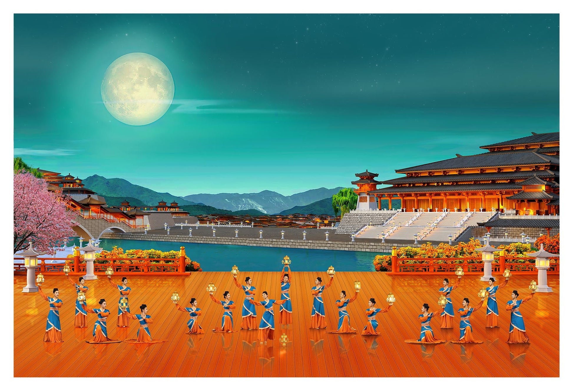 此幅畫作的場景取自神韻舞蹈作品《漢麗舞燈》:和風拂面,柳桃輕飄,月影庭前繞。宮燈照麗影,人比桃花俏。
