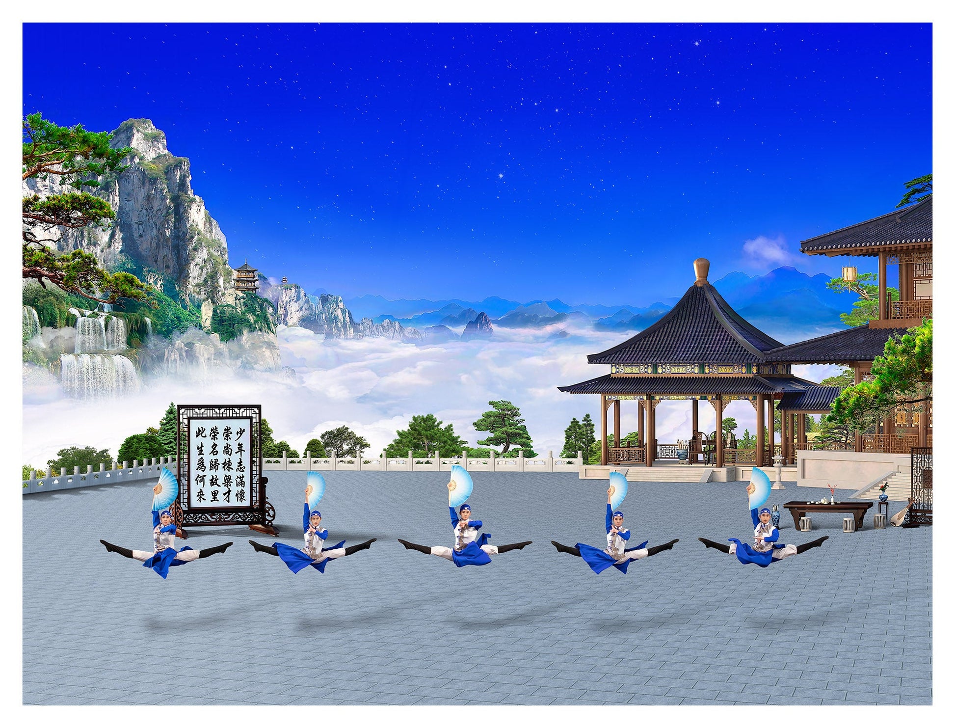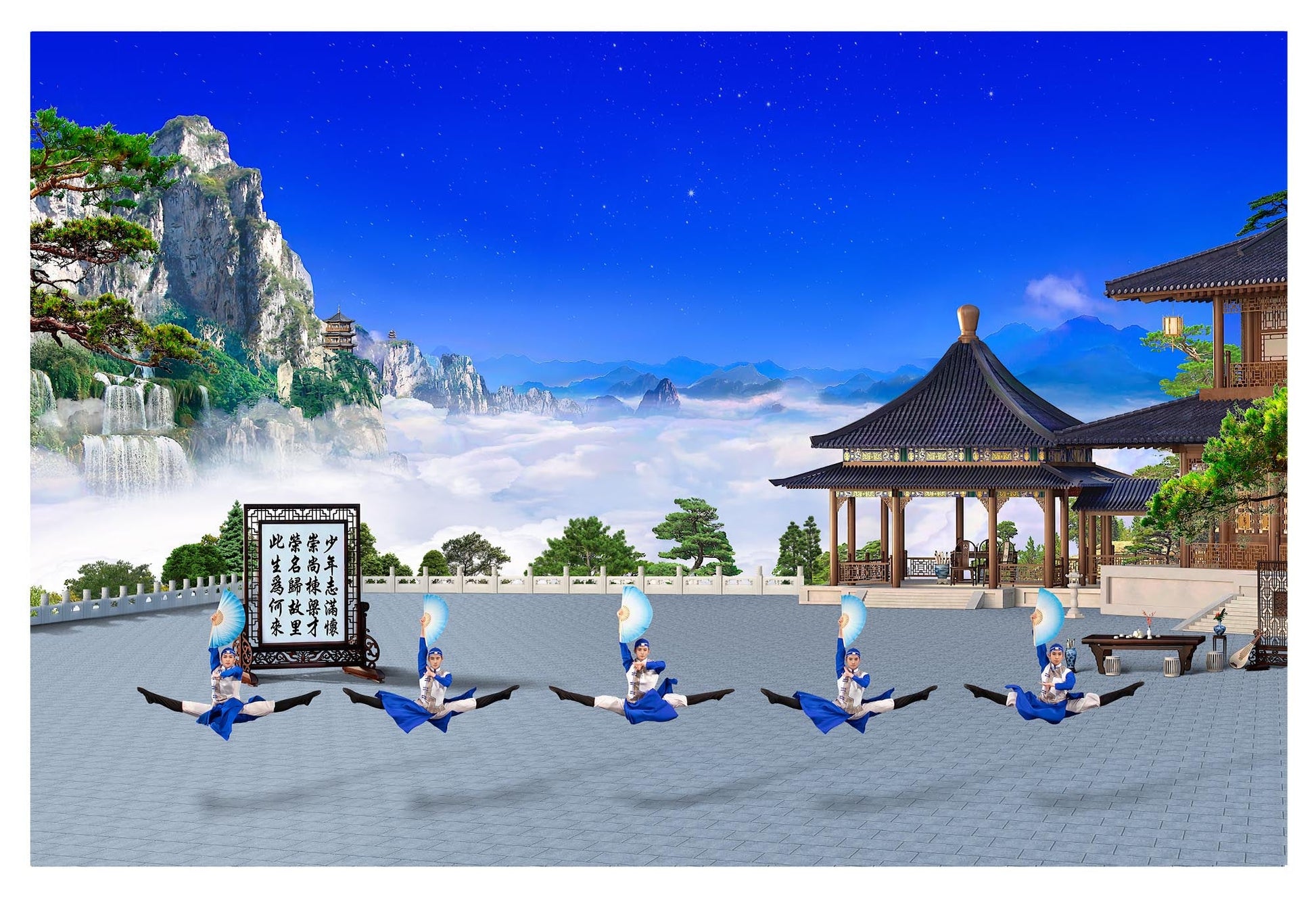 此幅畫作的場景取自神韻舞蹈作品《觀畫入境》:畫中的少年風流俊逸,觀畫的閨秀才貌雙全,時空交錯,讓他們有了一次神奇的相會。少年們正為一首未完成的詩句冥思苦想:「少年志滿懷,崇尚棟樑才。榮名歸故里...」閨秀為他們續了一句點睛之筆:「此生為何來?」讓少年們茅塞頓開,喜出望外。