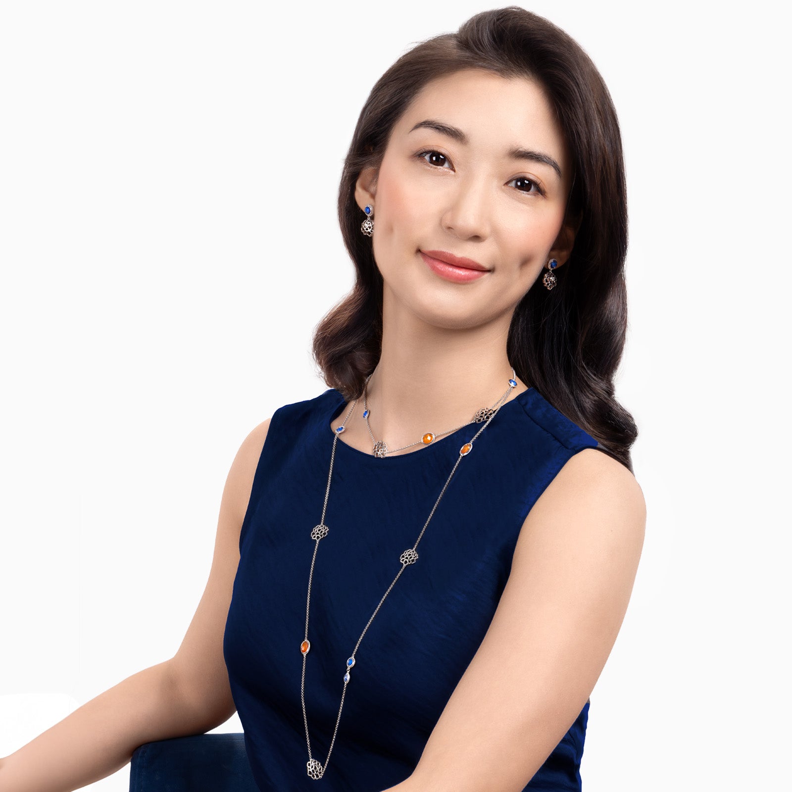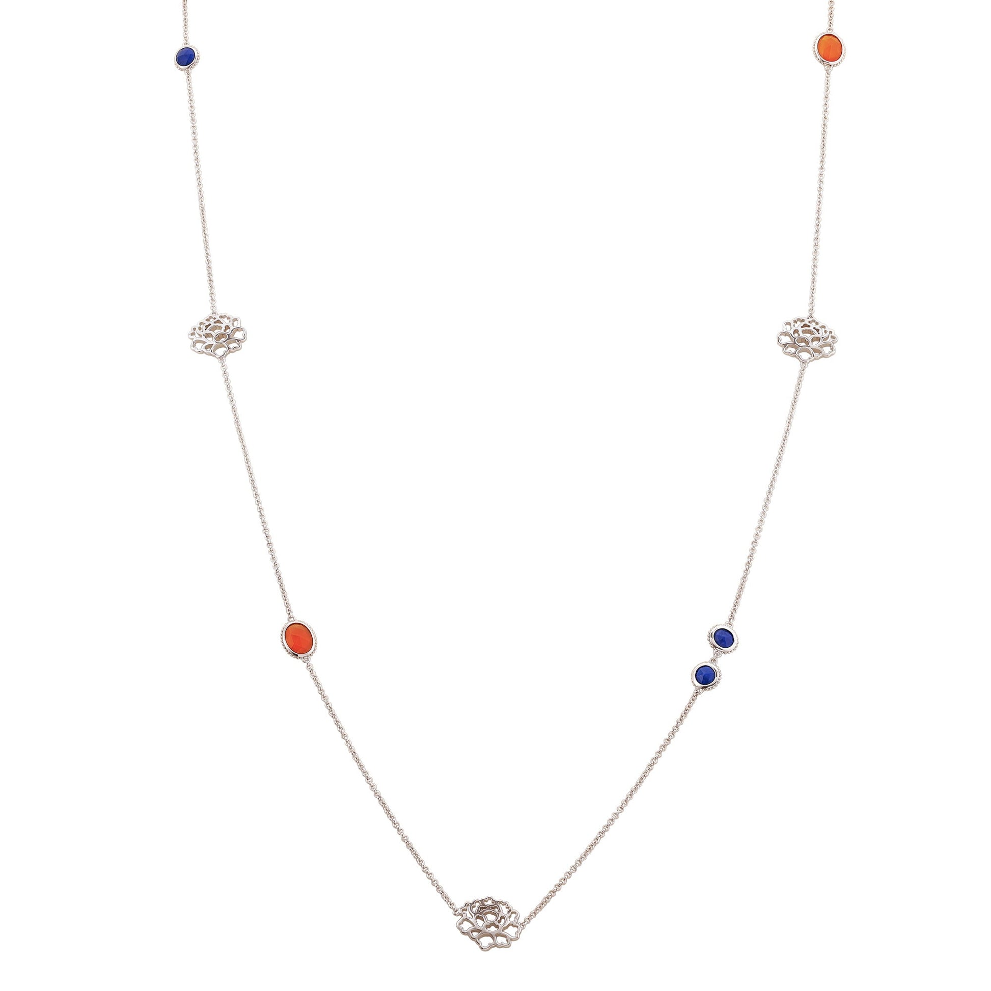• Length: 35” • Orange Carnelian: 7mm x 9mm • Lapis: 6mm x 6mm • Rhodium plated sterling silver • Tang flower: 16mm x 13.5mm x 2.2mm (thickness) Made in Thailand