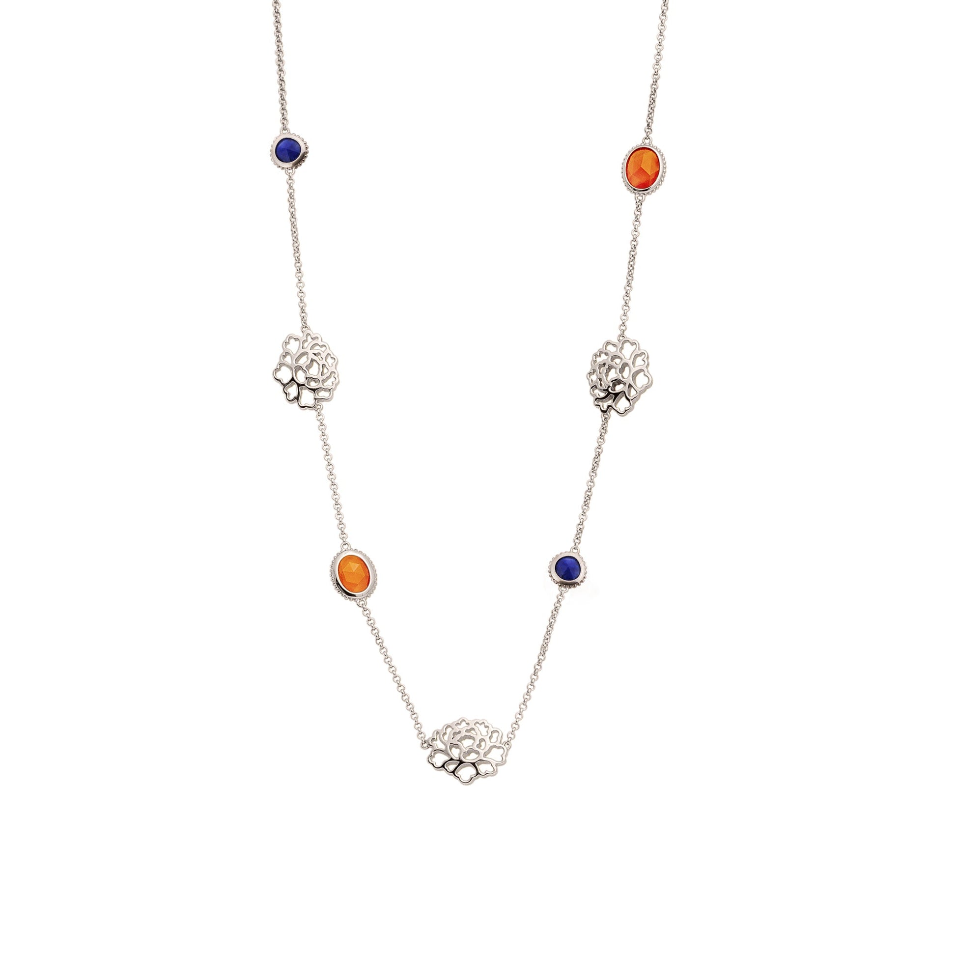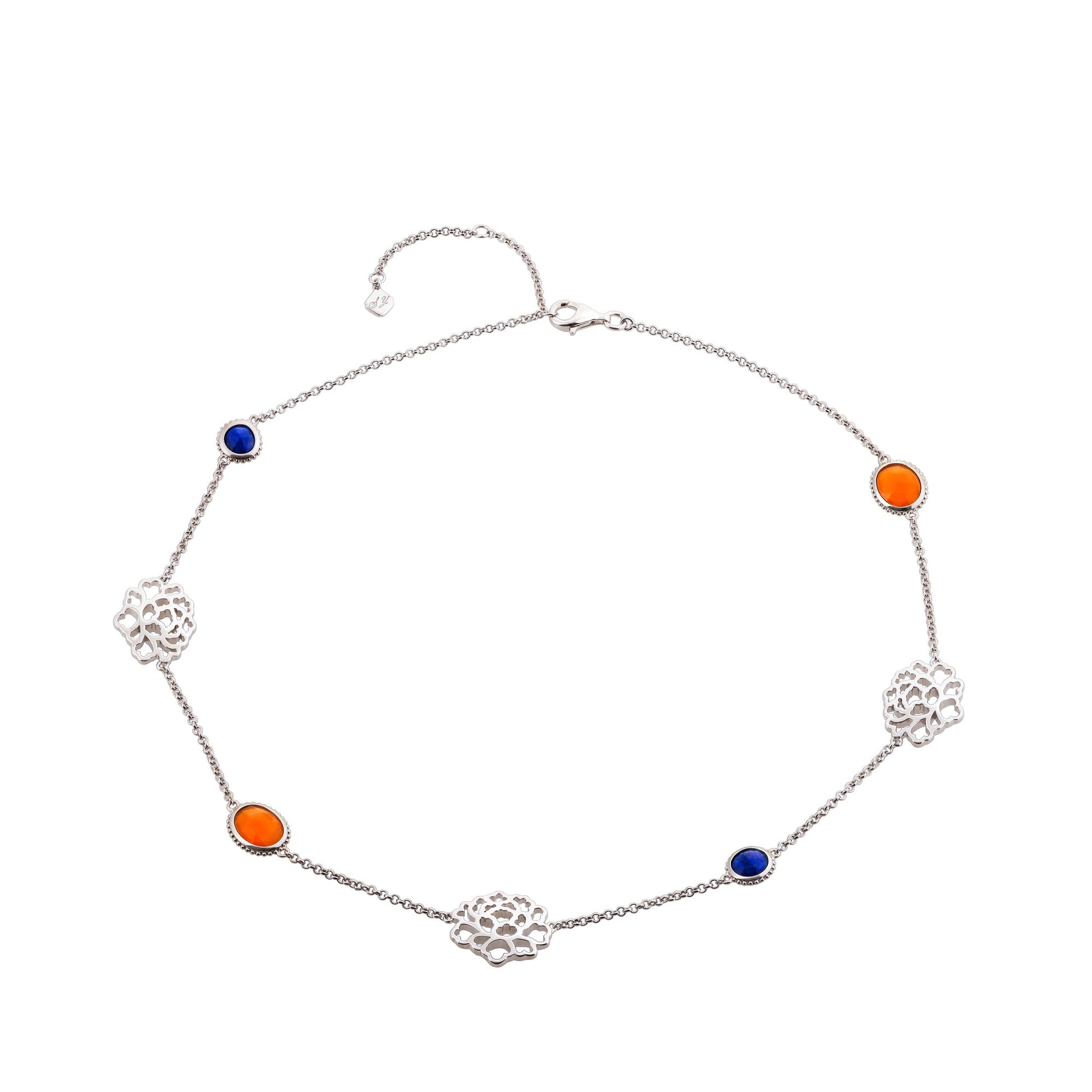 • Length: 16” + 2” extender • Orange Carnelian: 7mm x 9mm • Lapis: 6mm x 6mm • Rhodium plated sterling silver • Tang flower: 16mm x 13.5mm x 2.2mm (thickness) Made in Thailand