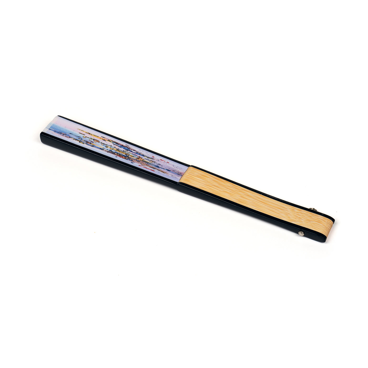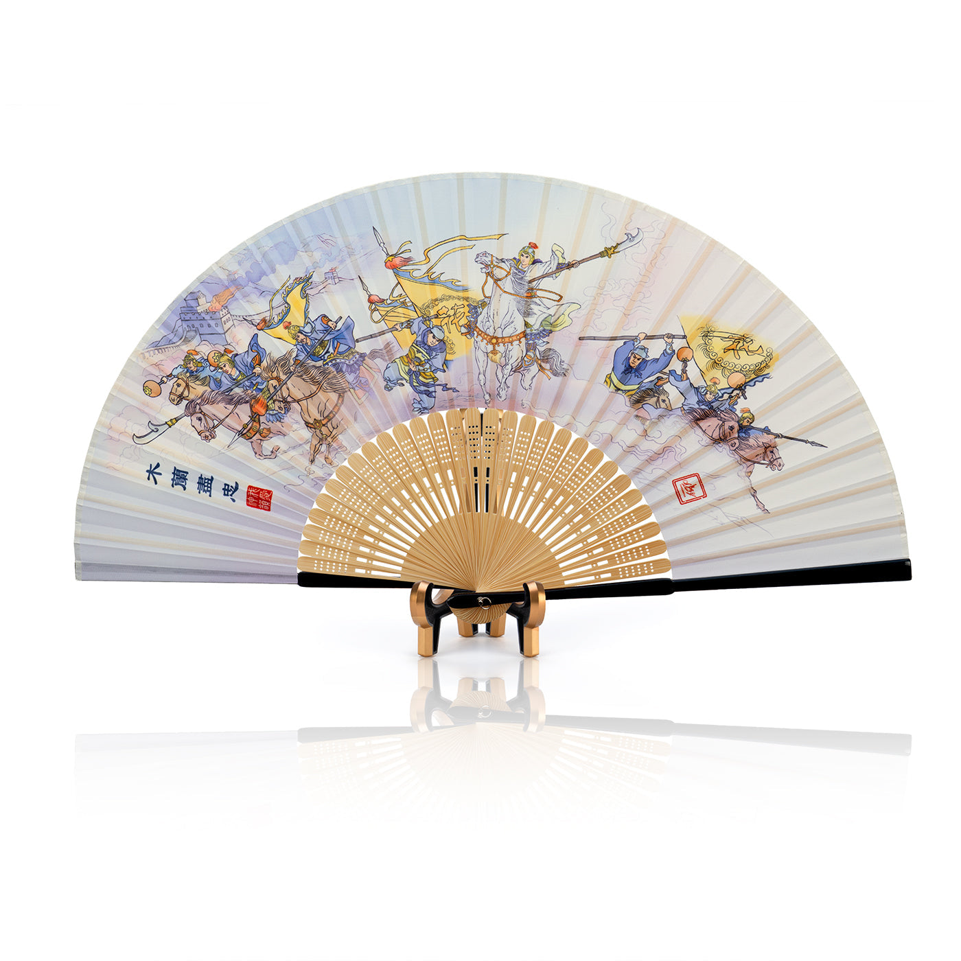 花木蘭是民間傳說忠孝兩全的巾幗英雄。北魏遷都洛陽後受北方遊牧民族侵犯,朝廷徵召每戶一名男子上戰場,木蘭考量父親年紀已大,弟弟尚幼,於是女扮男裝替父從軍,十二年後功成不居返家孝親。此摺扇的設計靈感源自神韻節目《木蘭從軍》,將木蘭代父盡忠於戰場上英勇領兵直前的舞台場景再現其設計中,以典雅貴氣的色彩盡顯木蘭從軍時的堅毅精神,願為您的生活帶來啟發。