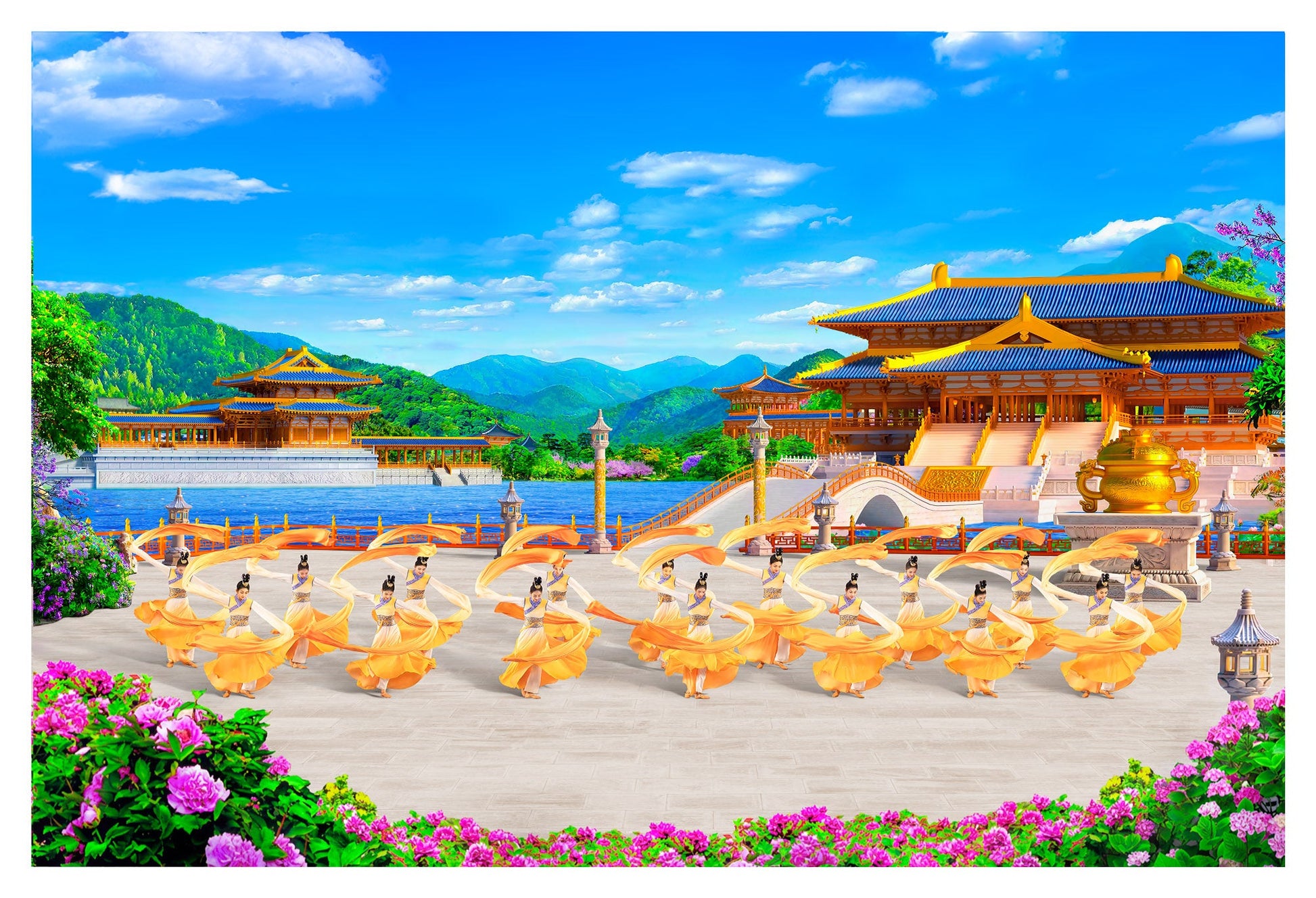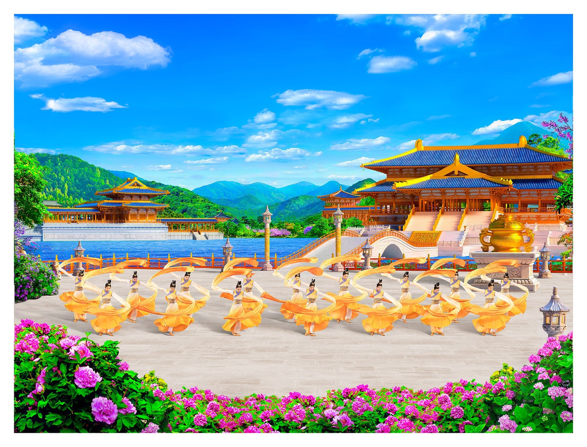此幅畫作的場景取自神韻舞蹈作品《袖舞倩影》:長樂宮前,太液池邊,佳人婉轉,長袖與春風共舞,俏臉同群芳爭豔。