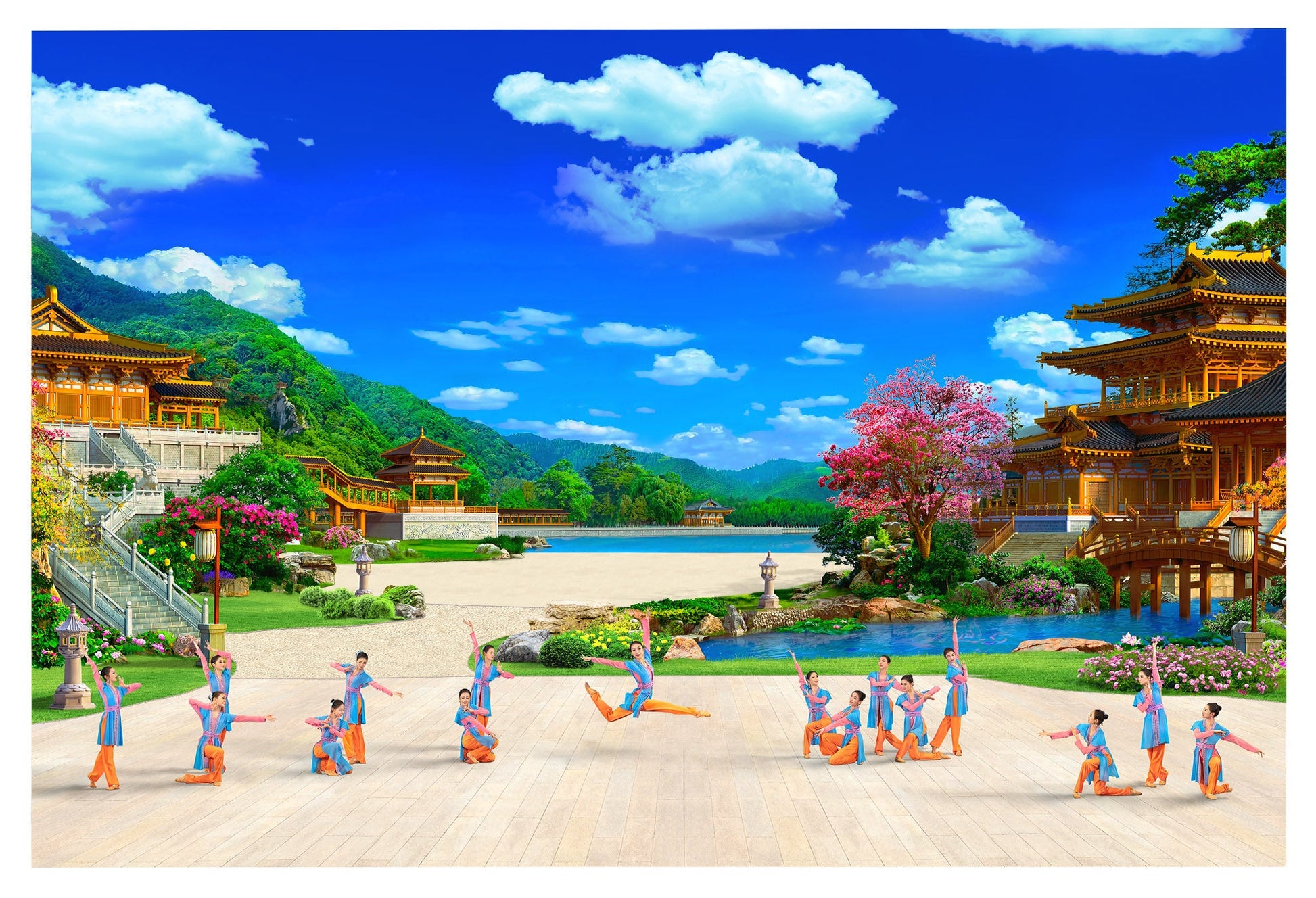 此幅畫作的場景取自2024年神韻舞蹈作品《女子古典舞》:流水洗淨塵煙,薰風捲起珠簾。忽聞佳人笑語,婉轉歌舞庭前。