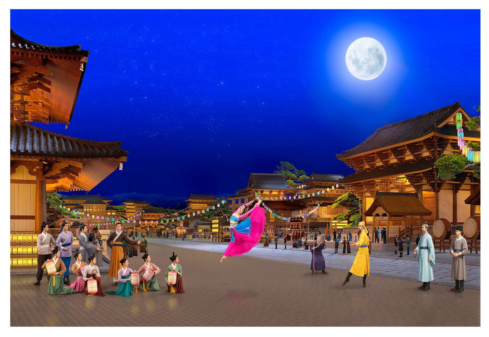 此幅畫作的場景取自神韻舞蹈作品《月宮會嫦娥》: 中秋之夜,風清月白,相傳唐太宗受嫦娥之邀,做客廣寒宮。仙娥相迎,起舞助興。