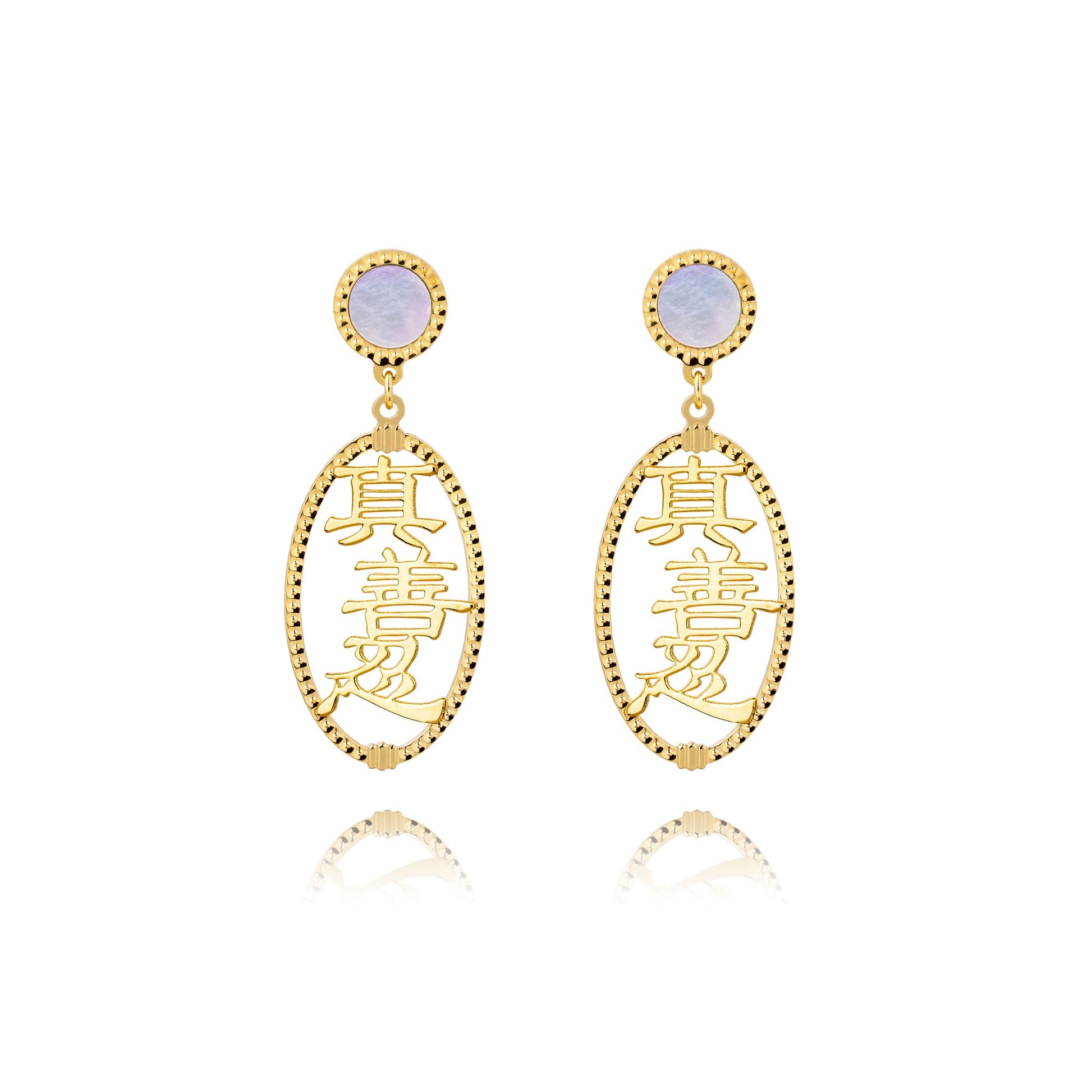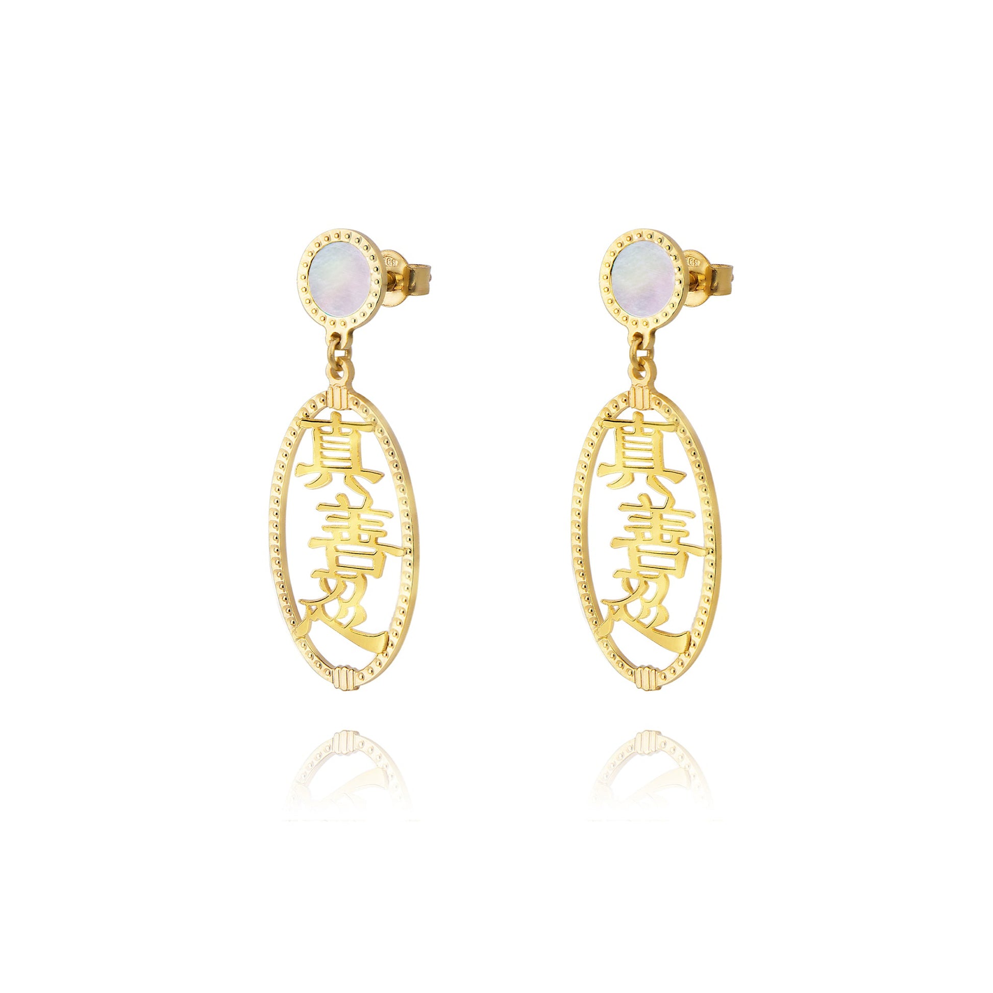 Zhen Shan Ren Words Earrings 14kt with white MOP